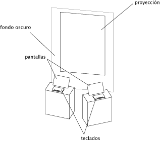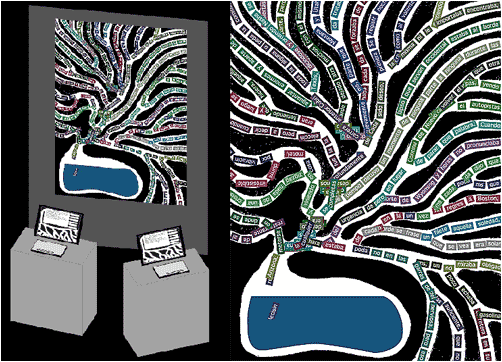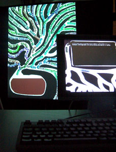 En un pequeño recinto hay dos pantallas, cada un aacompañada de un teclado, y proyectado en el fondo se ve una forma orgánica, un estómago con varios intestinos. En las pantallas se ven cajas de texto en donde es posible escribir.